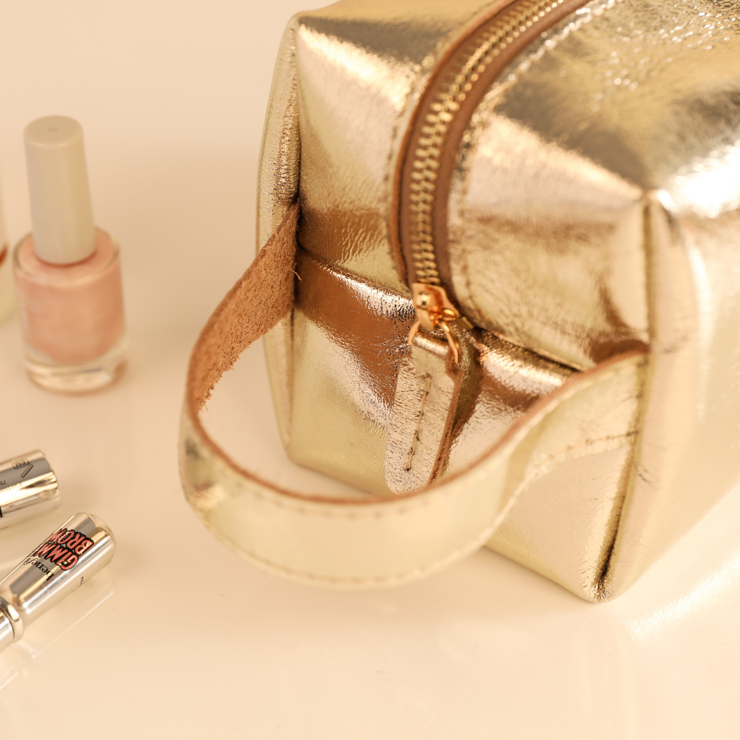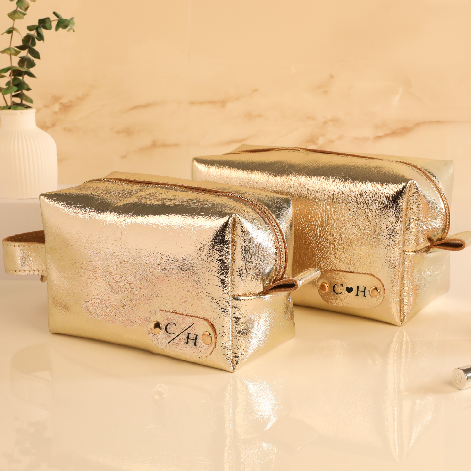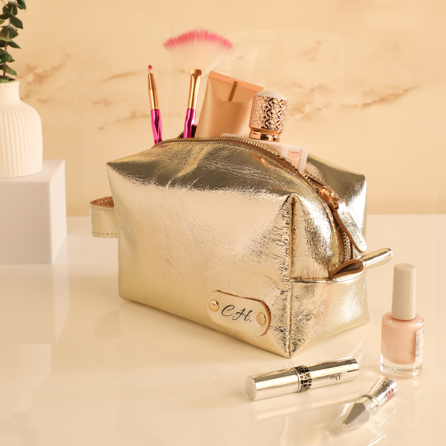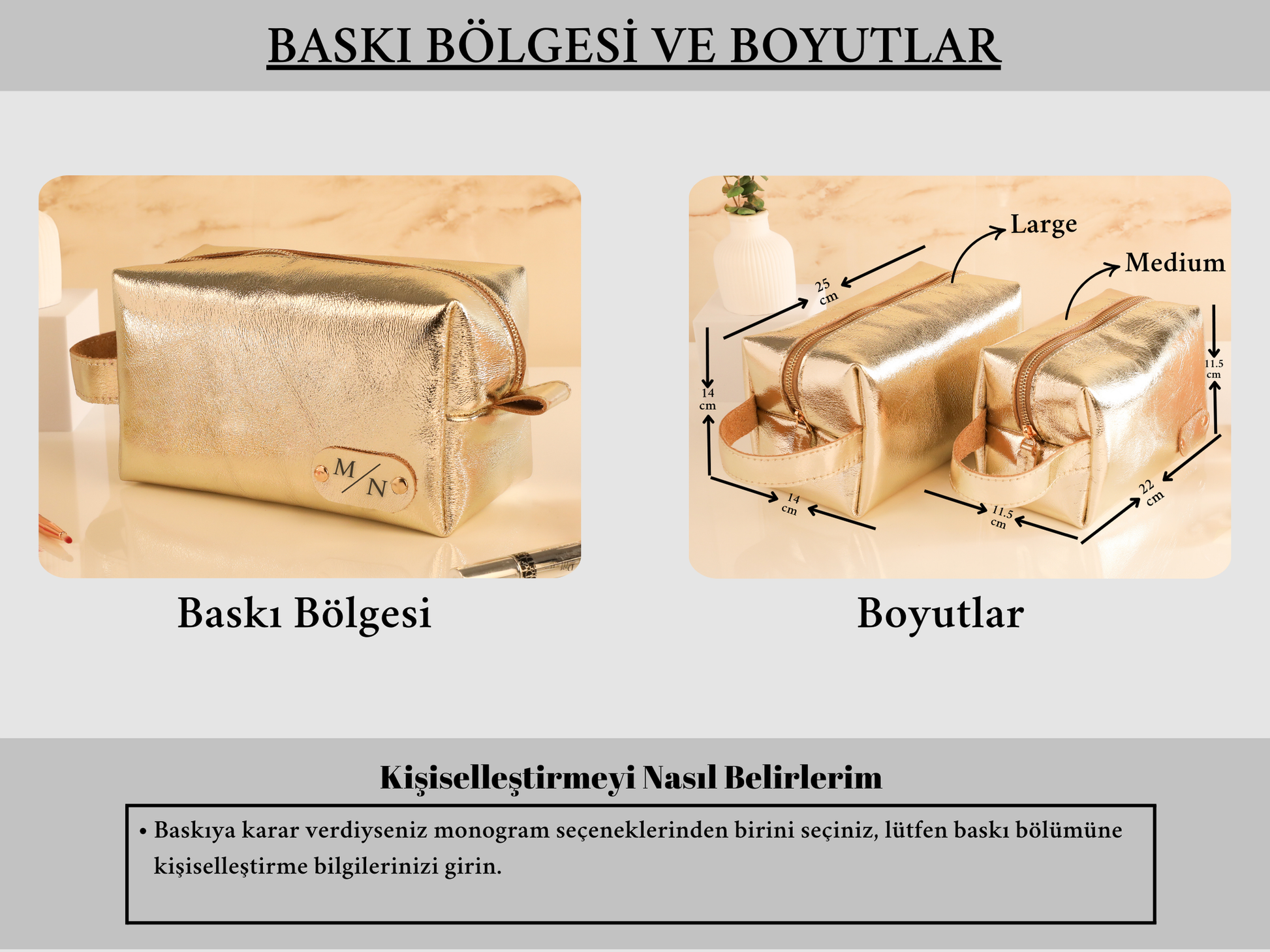 Gold metalik yüzeyi ve kişiye özel isim etiketiyle tasarlanan bu makyaj çantası, hem tarzını tamamlar hem de kozmetik ürünlerini düzenli tutar.